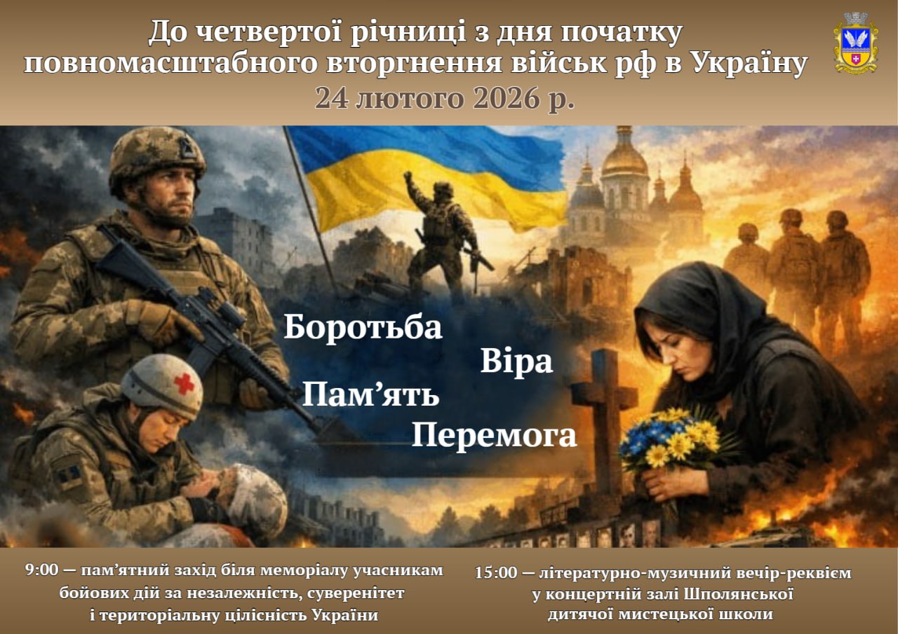 У вівторок, 24 лютого, у Шполянській громаді відбудуться заходи до четвертої річниці початку повномасштабної війни за незалежність України. Події приурочені до Національного дня молитви. О 9:00 біля пам’ятного знака учасникам бойових дій за незалежність, суверенітет і територіальну цілісність України проведуть пам’ятний захід «Україна... Роки болю, незламності і сили». О 15:00 у концертній залі Шполянської дитячої...