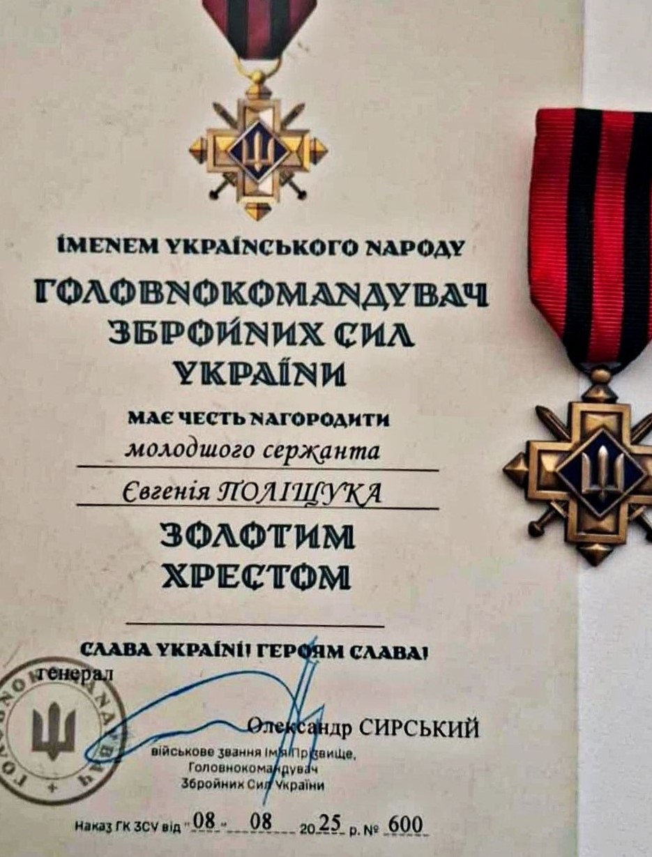 Молодшого сержанта Євгенія Поліщука зі Шполи відзначили державною нагородою — відзнакою «Золотий Хрест». Нагороду військовослужбовець отримав за проявлені мужність, відданість та службу в обороні України. «Золотий Хрест» є однією з військових відзнак, якою нагороджують українських захисників за особисту відвагу та виконання бойових завдань. За інформацією Шполянської міської ради