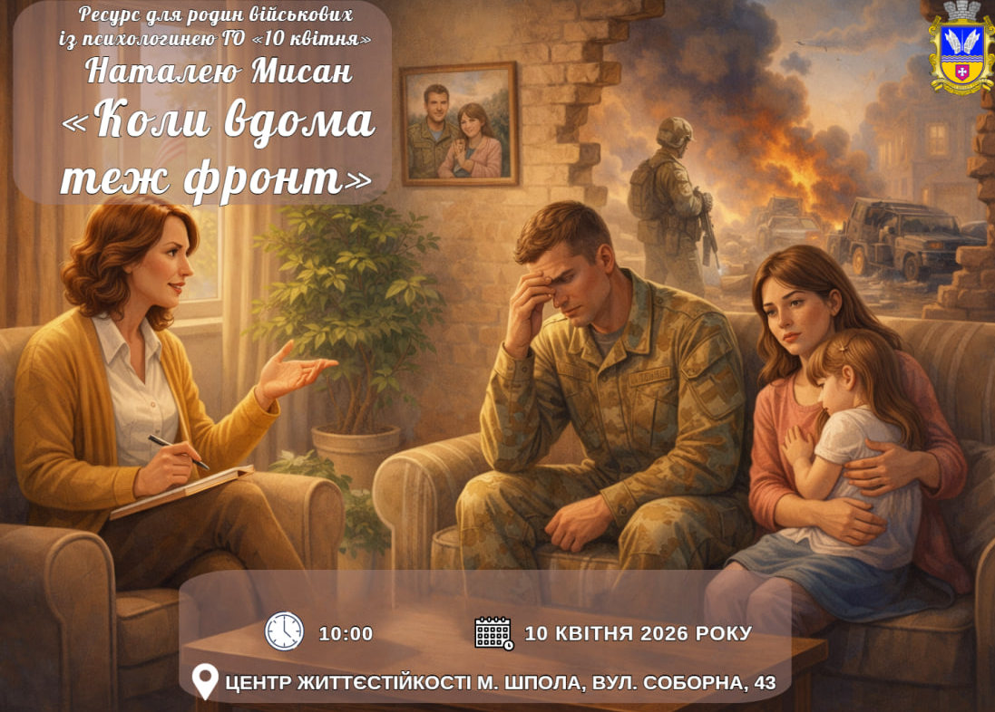 У Шполі відбудеться зустріч підтримки для родин військовослужбовців. Захід проведуть 10 квітня о 10:00 у Центрі життєстійкості. Учасники матимуть можливість поспілкуватися з психологинею громадської організації «10 квітня» Наталією Мисан на тему «Коли вдома теж фронт». Організатори запрошують усіх, хто потребує підтримки, розуміння та спілкування в колі людей із подібним досвідом. Захід відбудеться за адресою: м....