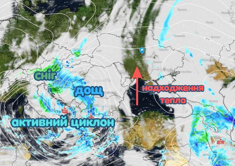 Сонячна антициклональна безтурботність на Черкащині закінчилася. Атмосфера стає динамічнішою. Наповнена полярним холодом улоговина поширилася до берегів Італії, де на контрастах температури над теплою Генуезькою протокою запустився процес циклогенезу. На Балкани вже прямує активний, добре заряджений енергією і вологою циклон з сильними дощами, грозами, місцями навіть випадатиме сніг. А Черкащина отримає від цього вихору сплеск тепла та невеликі дощі.