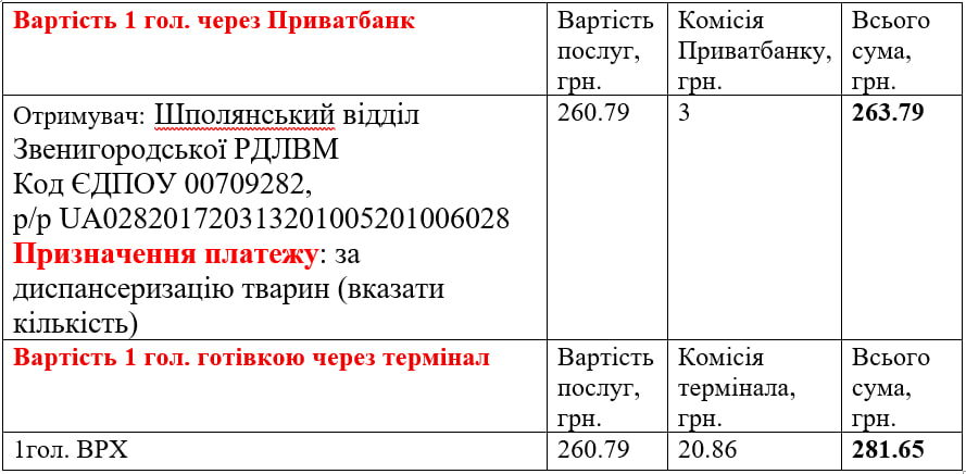 Якщо в господарстві утримується більше однієї тварини, вартість виклику ветеринарного спеціаліста становить одноразово 86,02 грн. Оплатити послуги можна за реквізитами або готівкою через термінал.