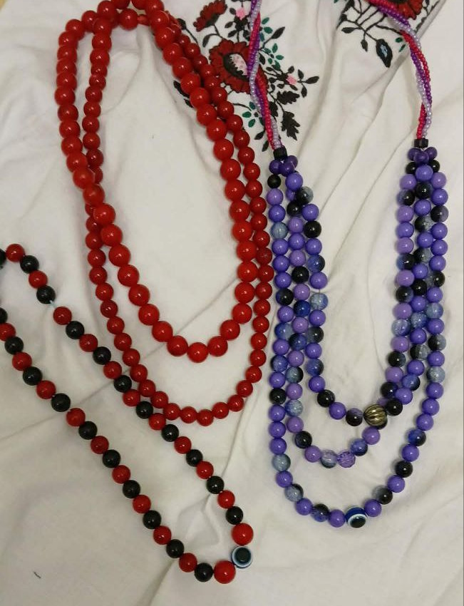 «Спочатку викладаю намистини на тканину або серветку, планую композицію, визначаю, які будуть більші, які - менші, підбираю кольори. Потім нанизую їх на нитку, прораховую кількість, вирішую, чи буде один ряд, два чи більше. Застібки шукаю в магазинах або використовую зі старих бусів, аби нічого не кололо. Іноді додаю бісер або дрібні деталі, щоб намисто було більш живим та унікальним. Усе це потребує уваги і фантазії, бо кожна деталь важлива і має пасувати до інших», - пояснює жінка.