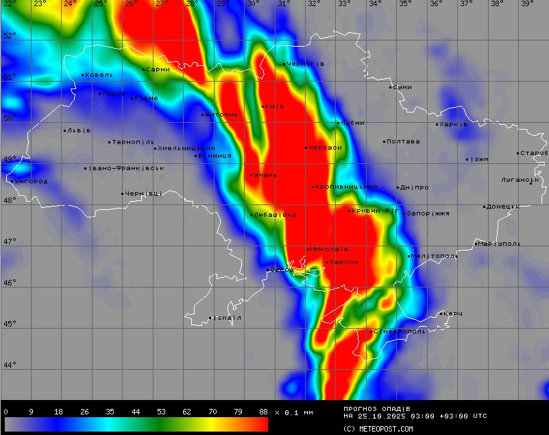 На Черкащині діє попередження про небезпечні метеорологічні явища – вночі 25 жовтня по Черкаській області та м. Черкаси очікуються значні дощі (15–49 мм за 12 годин і менше), I рівень небезпечності – жовтий.