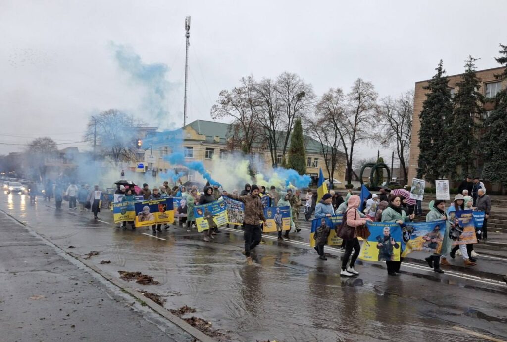 У Звенигородці 23 листопада пройшов марш “Надії” на підтримку родин військовополонених та безвісти зниклих захисників. Захід розпочався о 9:00 біля пам’ятника Тарасу Шевченку загальнонаціональною хвилиною мовчання, після чого кілька сотень містян, попри сильну зливу, пройшли проспектом із державними прапорами та портретами бійців, на повернення яких чекають їхні родини.