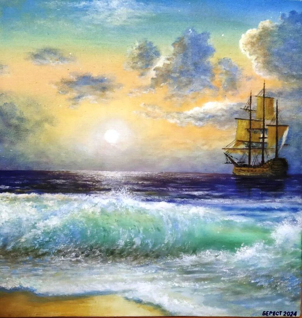 «Це не просто так - сів і намалював. Там багато нюансів, що за чим робити по черзі. Я тоді дивився сайт одного художника, Сахарова. За його відеоуроком я намалював першу картину. Це був ранковий пейзаж - сонце тільки-но піднімається з-за моря, рожеві та блакитно-бузкові тони, а вдалині вітрильник. Я її за два дні намалював».