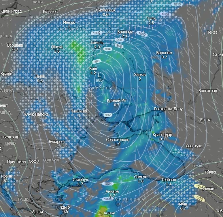 Циклон сформувався в умовах значного контрасту повітряних мас. У тиловій частині — арктичний холод, у теплому секторі — тропічне тепло із Середземномор’я. Таке поєднання зумовлює небезпечну й різну погоду в Україні: у західних областях — сильний сніг, хуртовини та перемети на дорогах, на півдні — грози, а Черкащина вже сьогодні очікує значні дощі. Контрасти фактичної температури вражають: Дніпро +6°, Одеса +10°, Сімферополь +13°, Львів — 5° морозу.