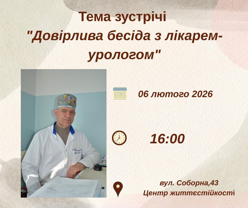 Зустріч на тему «Довірлива бесіда з лікарем-урологом Андрієм Павловичем Домчуком» пройде 6 лютого о 16:00. Учасники зможуть дізнатися, як підтримувати здоров’я сечостатевої системи в різному віці, які методи профілактики є ефективними та в яких випадках не варто відкладати візит до лікаря. Формат передбачає живе консультативне спілкування - кожен охочий зможе поставити запитання.