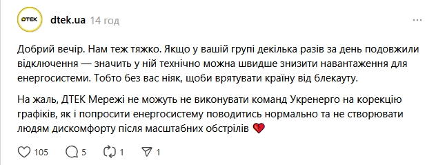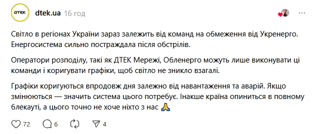 У компанії ДТЕК пояснили, що ситуація в енергосистемі України залишається складною після масованих обстрілів. Наразі подача електроенергії в регіонах залежить від команд на обмеження, які надсилає Укренерго. Графіки коригуються залежно від навантаження та аварійних ситуацій.