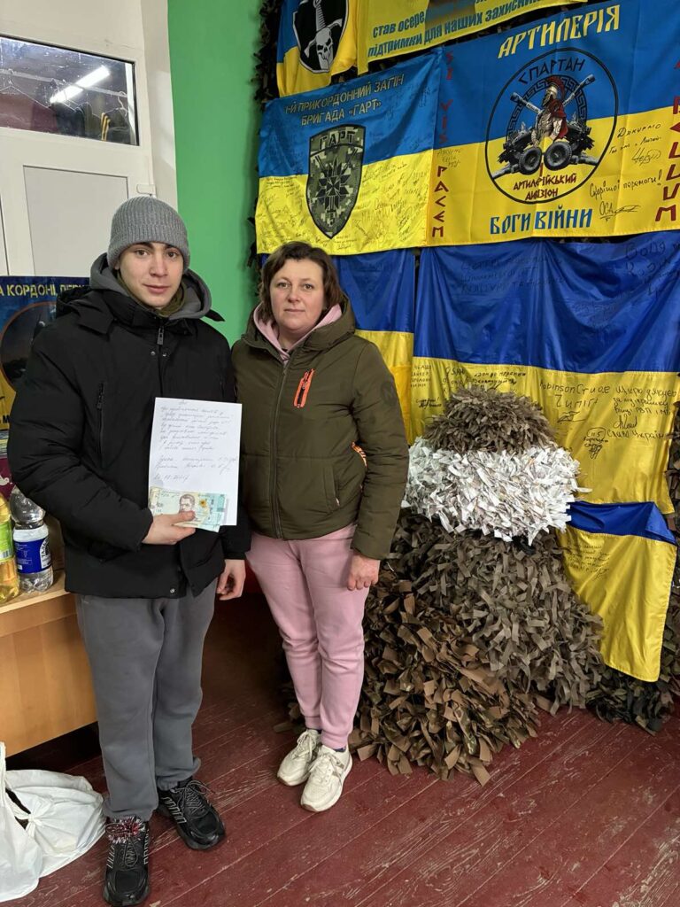 Того ж дня Центр гуманітарної допомоги отримав ще одну важливу підтримку: діти із села Скотареве передали 6 тисяч гривень, зібраних під час різдвяного колядування. Кошти одразу спрямували на закупівлю тканини для плетіння маскувальних сіток.