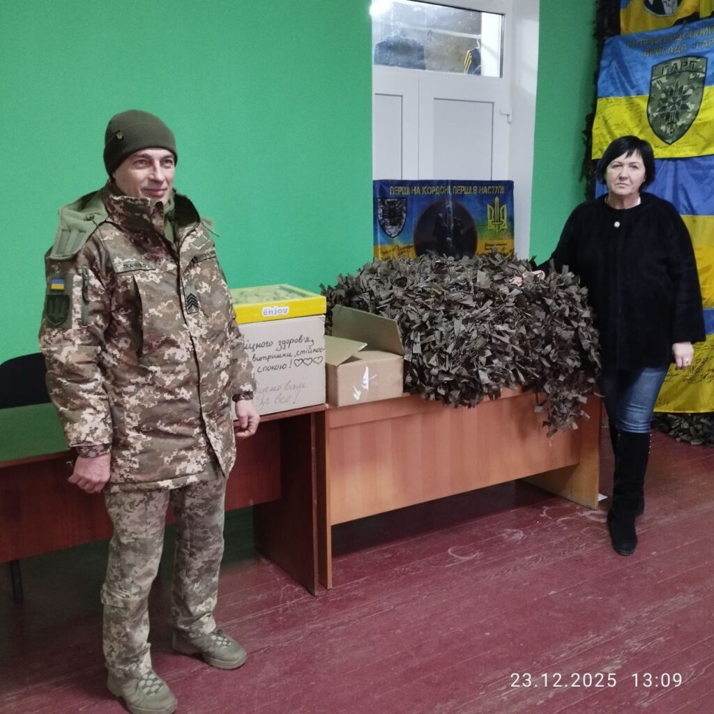 Для підрозділу воїна громада підготувала чергову партію допомоги. Захисникам передали смаколики, засоби гігієни, окопні свічки, дві маскувальні сітки, які сплели працівниці філій у селах Скотареве та Мар’янівка, а також різдвяні обереги, виготовлені дітьми.