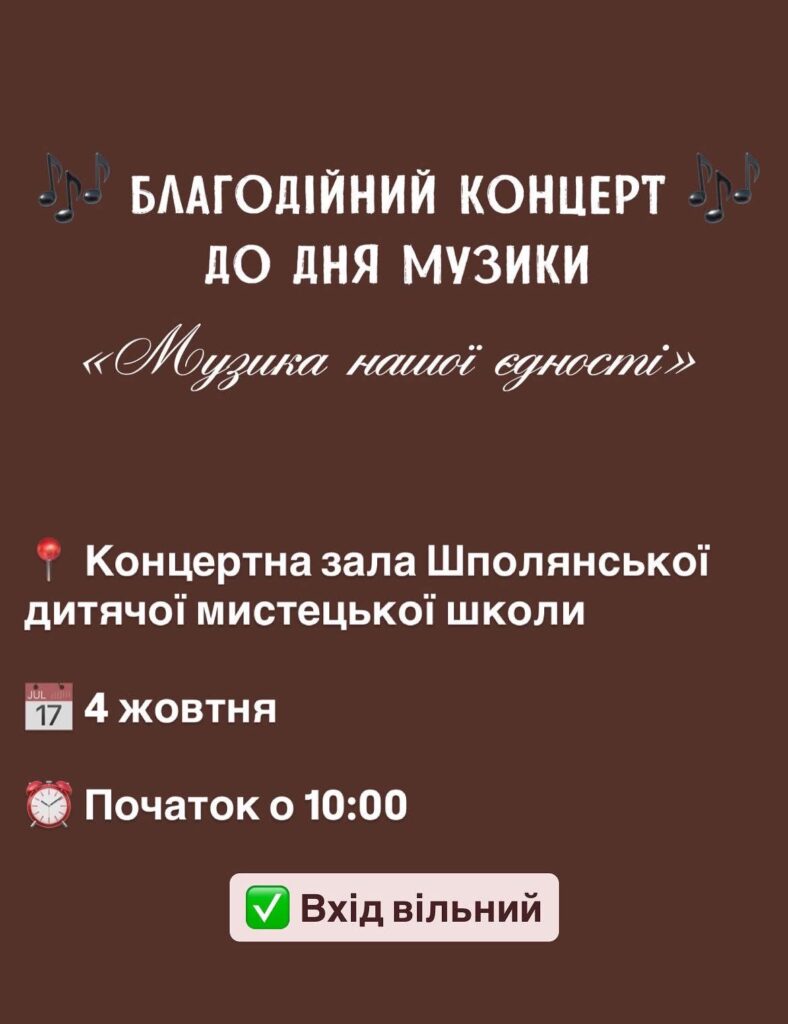 4 жовтня о 10:00 у концертній залі Шполянської дитячої мистецької школи відбудеться благодійний концерт «Музика нашої єдності», присвячений Дню музики.