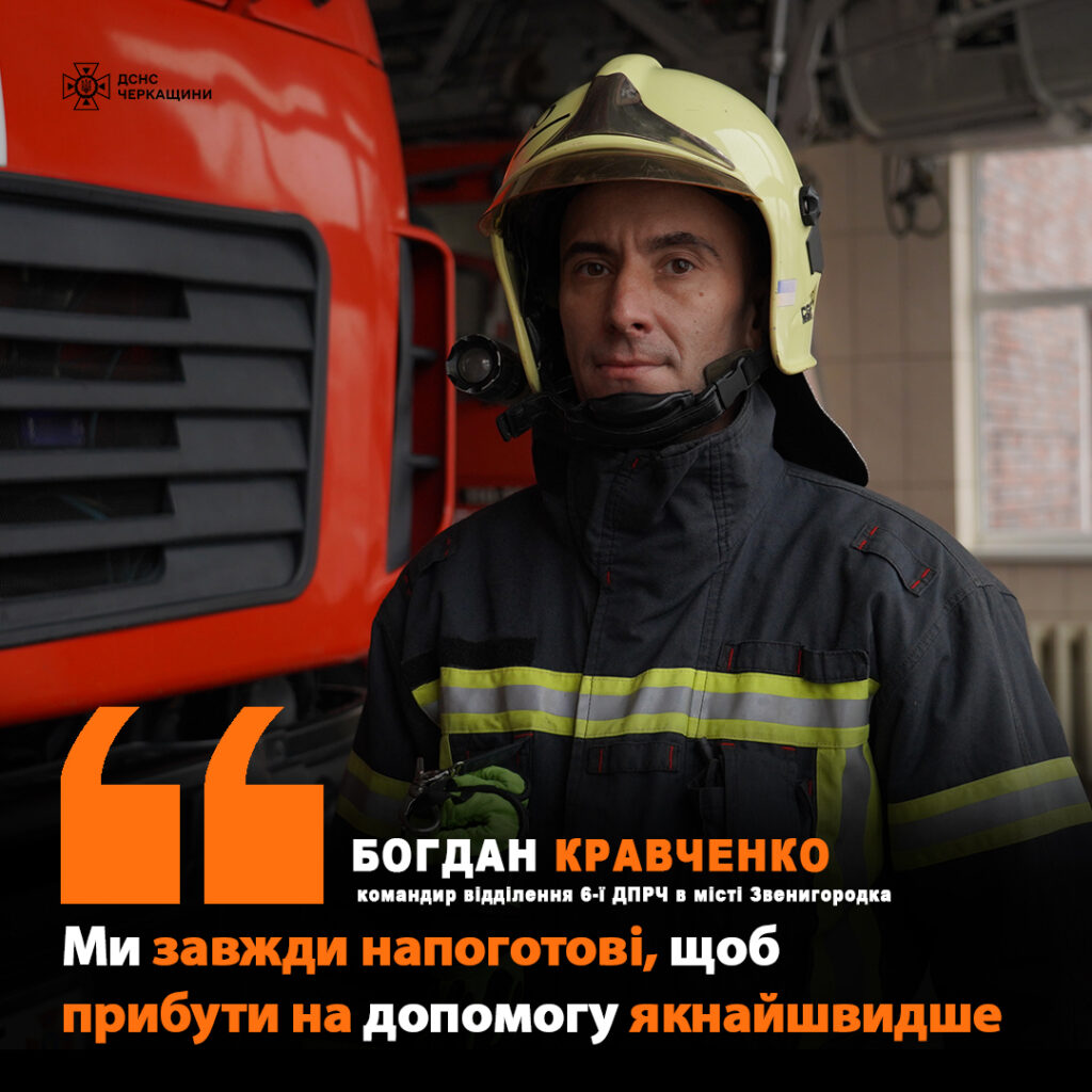 Командир відділення 6-ї ДПРЧ у Звенигородці Богдан Кравченко вже 20 років служить у ДСНС і знає ціну кожному виїзду. За цей час він пройшов сотні надзвичайних ситуацій - від побутових трагедій до роботи на місцях ракетних ударів.