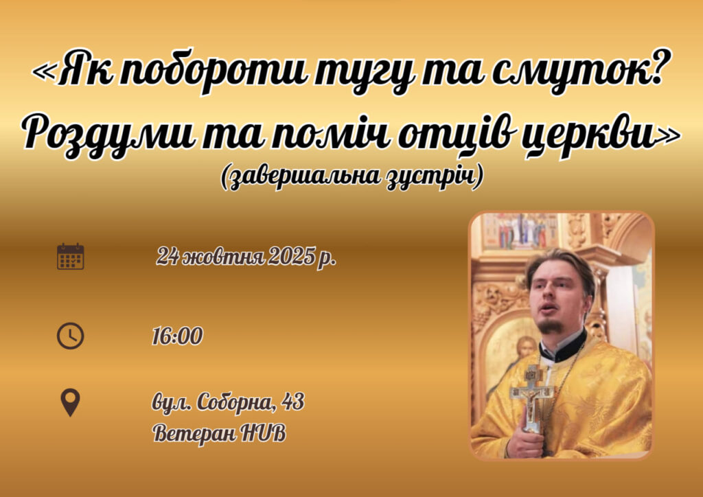 У п'ятницю, 24 жовтня, о 16:00 у приміщенні Ветеран HUB відбудеться завершальна зустріч із настоятелем храму Різдва Пресвятої Богородиці ієреєм Романом Саломатіним.