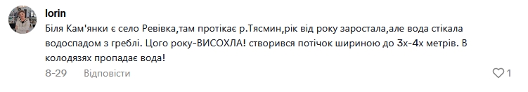 "Справді, рівень води у річці впав, хоч і не скажу наскільки, бо не експерт, - каже староста. - На щастя, не геть пересохло. В колодязях така ж проблема. Не скажу, чи у багатьох людей, статистики такої не вела, але є нарікання від жителів села, що кількість води зменшується. Я вже п'ятий рік працюю старостою села, то пам'ятаю, що вже щось подібне було. Коли тривало спекотне літо, рівень в колодязях також падав".