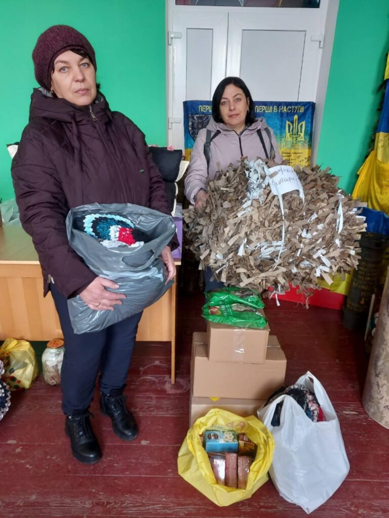 Жителі села Кримки підготували для військових вологі серветки, чай, продукти швидкого приготування, в’язані шкарпетки, килимки для сидіння, домашню консервацію, окопні свічки та випічку. Також діти передали захисникам малюнки й обереги.